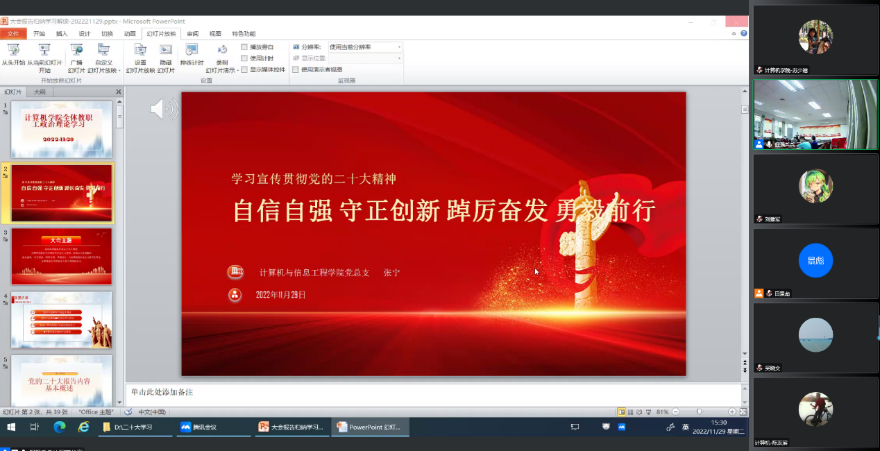 为深刻认识党的二十大的重大意义,切实推进党的二十大精神进校园、进课堂、进头脑,将思想和行动统一到党的二十大精神上来。11月29日下午,学校党的二十大精神宣讲团二级学院书记宣讲队成员、计算机学院党总支书记张宁为计算机学院全体教职工开展了一场题为《自信自强 守正创新 踔厉奋发 勇毅前行》的深入学习宣传贯彻党的二十大精神宣讲会。宣讲会由学院党总支组织委员代启兵主持,以线上线下相结合的方式进行。
