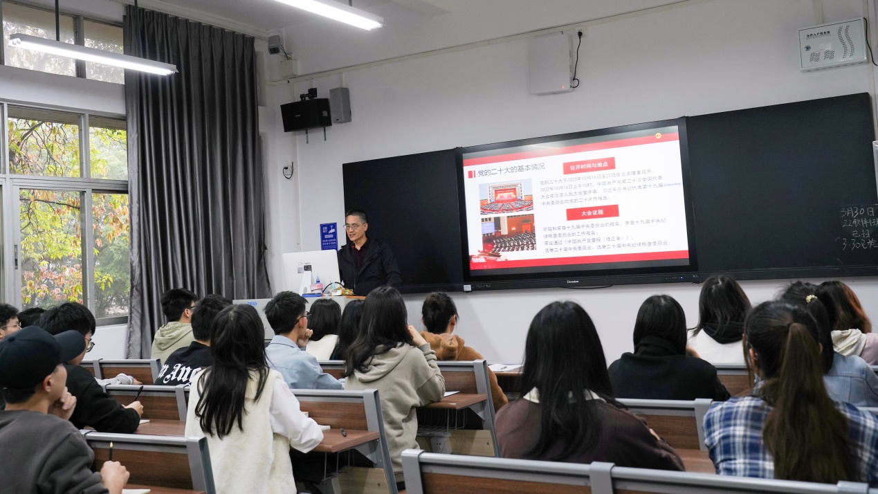 余棉水带着同学们一起回顾了党的十九届六中全会决议、党的二十大报告,他指出习近平新时代中国特色社会主义思想是对马克思列宁主义、毛泽东思想和中国特色社会主义理论体系的继承和发展,实现了马克思主义中国化时代化新的飞跃。在报告中,余棉水重点和同学们一起学习了二十大报告的第五章节“实施科教兴国战略,强化现代化建设人才支撑”,他说到职业教育未来前途广阔、大有可为,随着产业结构加速优化升级,各行各业对高素质的技能型人才的需求越来越迫切,职业教育在经济发展中的作用越来越明显,将为促进经济社会发展和提高国家竞争力提供有力的支撑。作为新时代大学生,同学们正处在重要的战略机遇时期,在校期间,应当大胆作为,力争成为高素质技术技能人才,以“能工巧匠”“大国工匠”作为自己的职业理想!