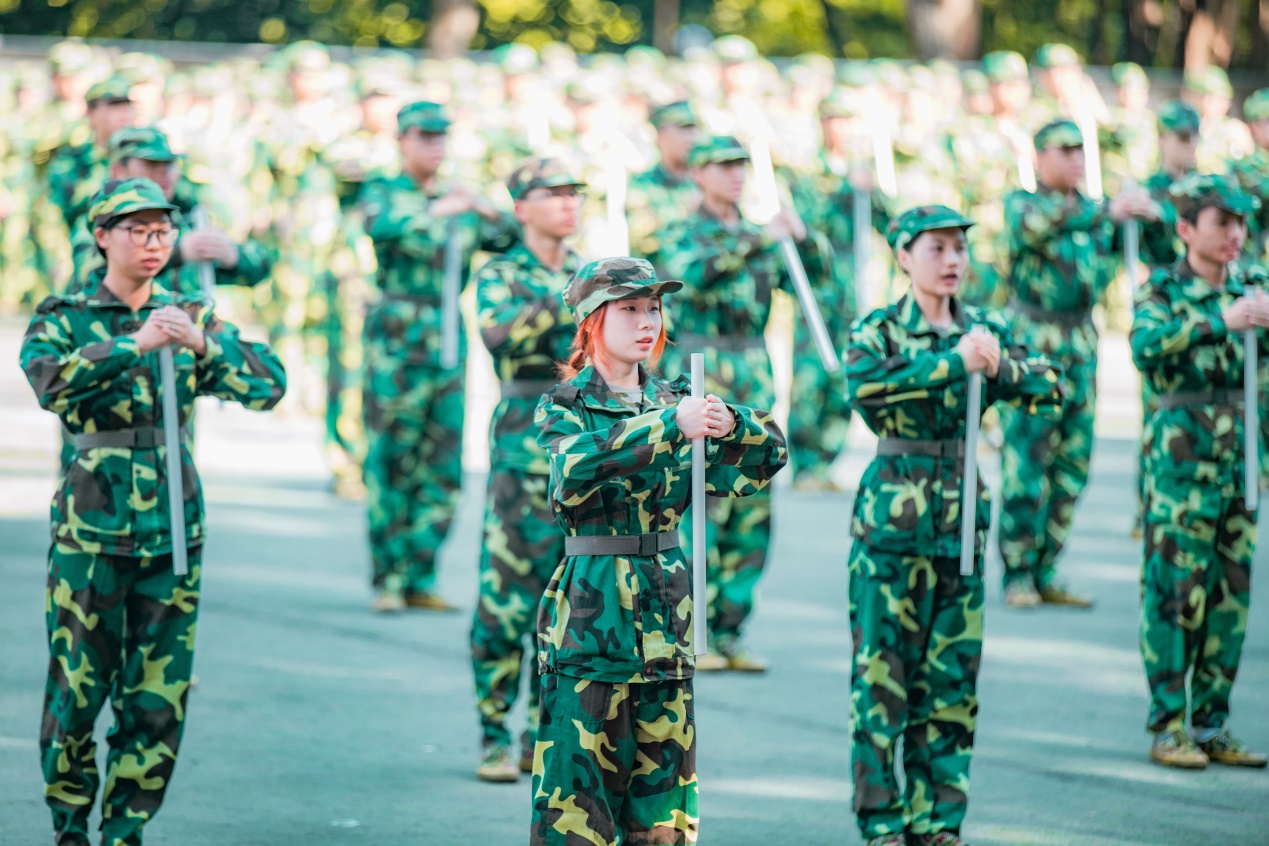 教官严肃认真地教学生们军姿站立、敬礼手势、正步走和行列齐走等系列规范动作。学生们在教官的口令下迅速做出相应的动作,展现出了该有的士气和坚定。