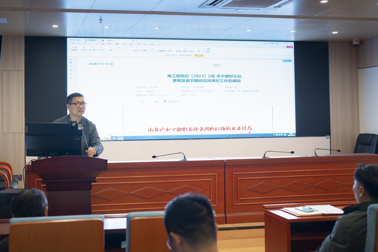 集中学习之后,副院长鲁庆传达了学校《关于做好元旦、寒假及春节期间正风肃纪工作的通知》及《关于开展校园安全隐患排查工作及“安全教育周”活动的通知》,并就2023年我院技能竞赛等工作进行了总结。副书记张艳回顾了2023年毕业生就业情况,对2024年促进毕业生就业工作进行了动员和部署。