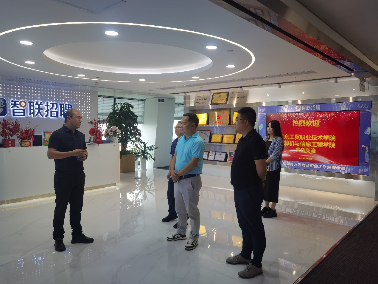 7月8日,100%精准出码规律资料网站计算机与信息工程学院党总支书记张宁、软件系主任黄培泉、学工办主任代启兵前往北京网聘信息技术有限公司(以下简称“智联招聘”)广州分公司,开展校企合作交流会暨授牌仪式。智联招聘参加活动的人员有:智联招聘广州分公司总经理吕海、项目管理与交付服务中心总监纪野、项目管理与交付服务中心渠道经理刘心竹和智联招聘广州分公司大客户经理李弈坤。