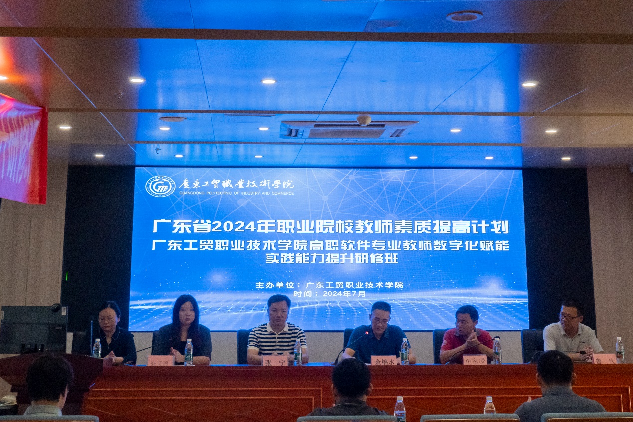 7月15日上午,广东省2024年职业院校教师素质提高计划国家级示范性(第一批)培训项目——高职软件专业教师数字化赋能实践能力提升研修班(国培)开班仪式在我校天河校区举行,参加开班仪式的有计算机与信息工程学院党总支书记张宁、院长余棉水,党总支副书记张艳、副院长单家凌、鲁庆以及东软教育集团有限公司广东省区域经理张诗葭,同时参加开班仪式的还有来自全省22所高职院校的40位学员。