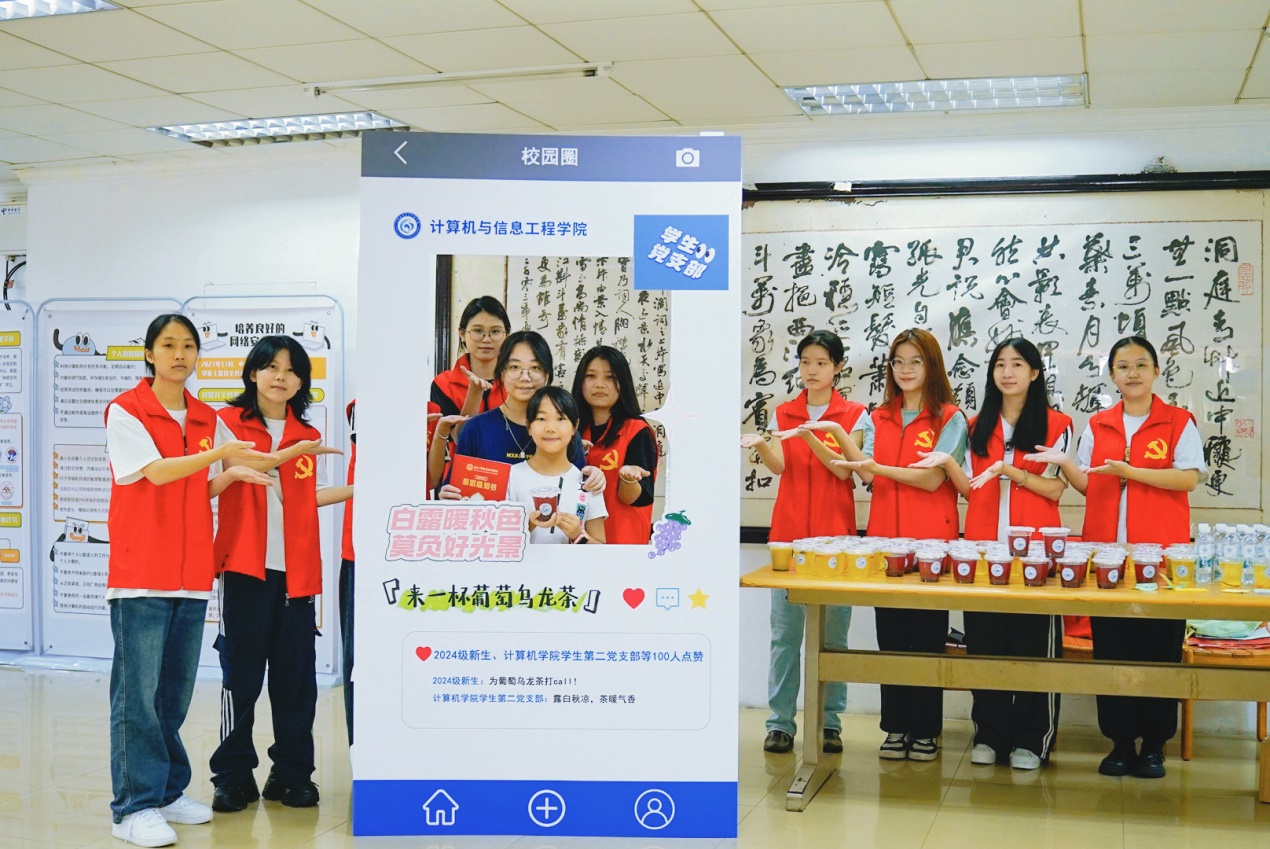 在欢乐愉快的氛围中,新生们和班主任、辅导员、师兄师姐们交流、与学院AI设备互动。计算机学院学生党支部在迎新现场手工制作了白露节气主题秋日饮品,吸引众多新同学前来品尝,拍照留念,并为自己的大学生活送上祝福,希望这抹甜蜜成为新同学新学期的温馨伴侣。
