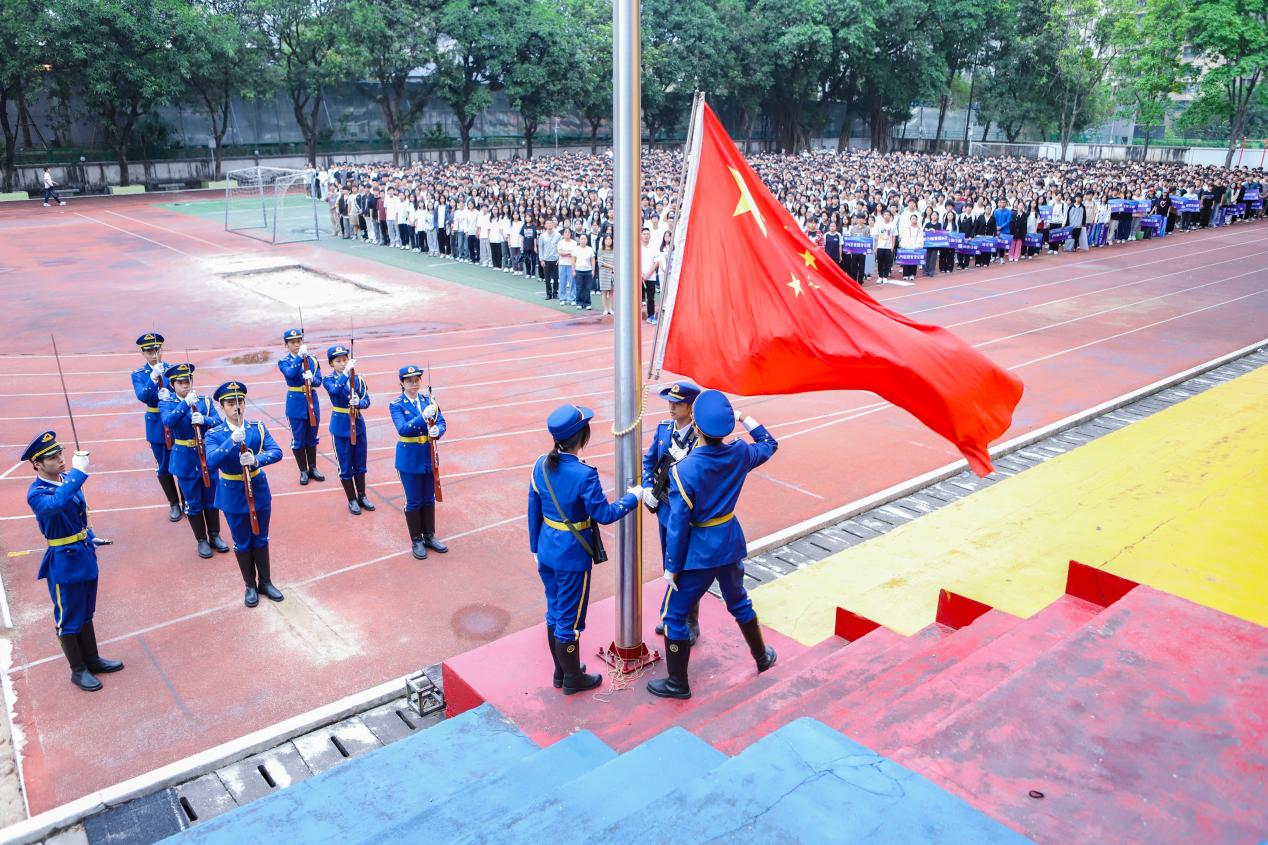 随着庄严的升旗仪式正式开始,国旗护卫队的同学们身着戎装,步伐铿锵,护送着鲜艳的五星红旗迈向升旗台。在全体师生的肃立注视下,五星红旗迎风招展,缓缓升起。与此同时,激昂的国歌在校园上空回荡,师生们齐声高唱,歌声嘹亮,充满力量,展现了炽热的爱国情怀。