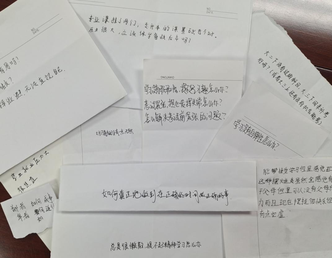 讲座结束后,邹少兰老师组织了一场互动环节,她邀请同学们以匿名小纸条的方式向刘敏老师提问,刘老师则逐一抽取纸条,耐心细致地为同学们答疑解惑。在轻松愉快的氛围中,同学们的疑惑逐渐消散,对于未来的学业蓝图也有了更加清晰的认识和规划。