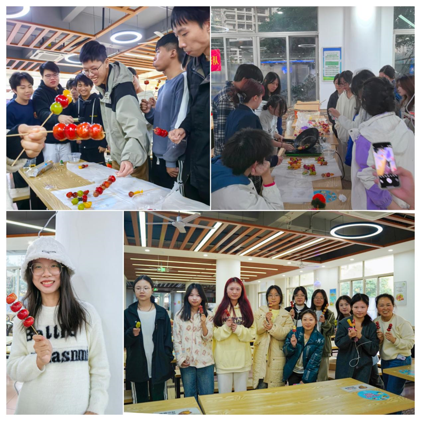 下午15:00活动正式开始,同学们在老师的带领下,参与到了从挑选水果、清洗、穿串,到熬制糖浆以及裹糖衣的全过程。同学们亲自动手尝试,看着自己手中的水果穿上晶莹剔透的糖衣,大家的脸上都露出了满意的笑容。这不仅是一次动手实践的机会,更是对传统手艺的一次深入了解和传承。