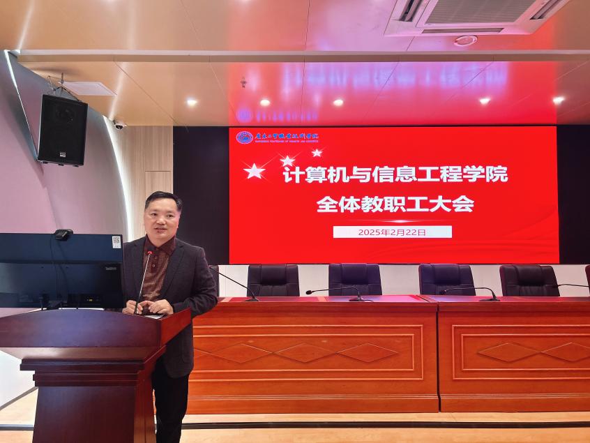 为全面部署2025年春季学期各项工作,确保新学期工作有序开展。2月22日,计算机与信息工程学院在天河校区实训楼报告厅召开全体教职工大会,会议由学院党总支书记张宁主持,全体教职工参加。