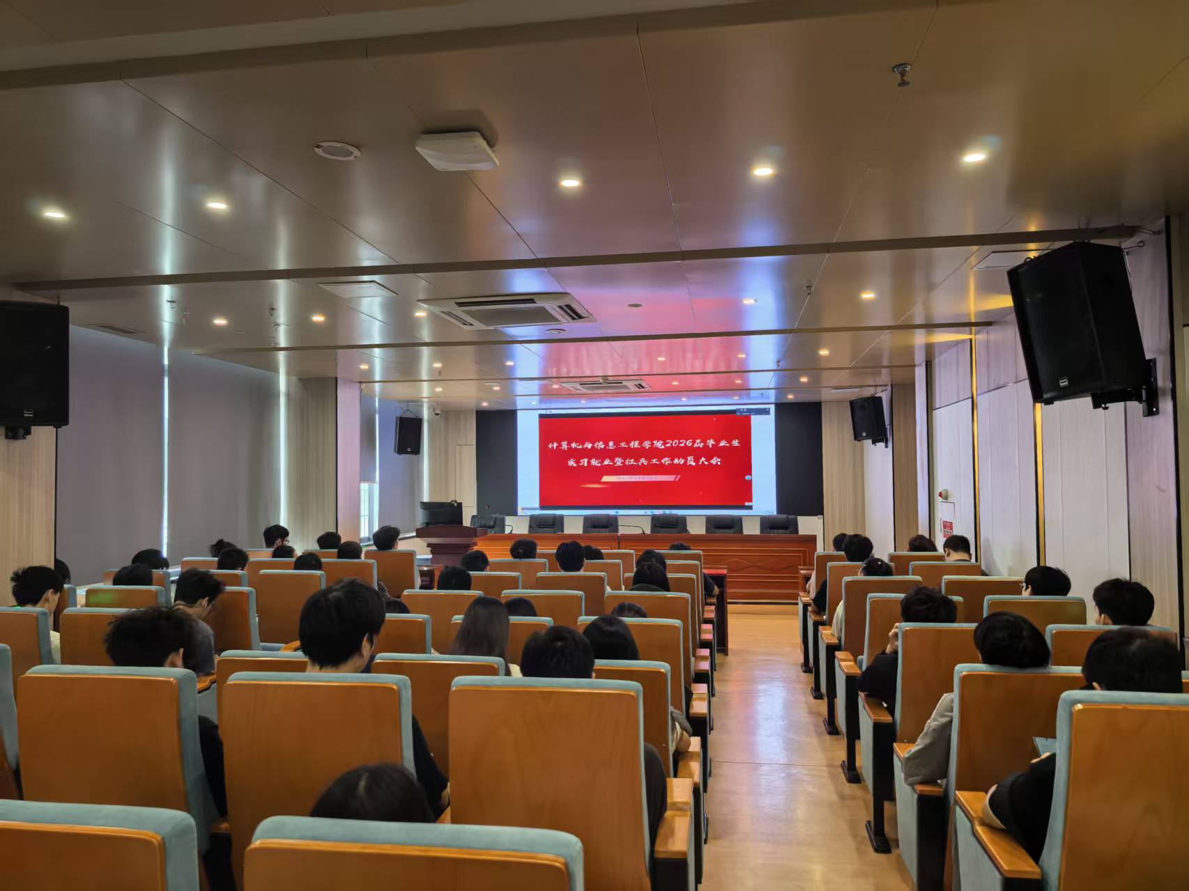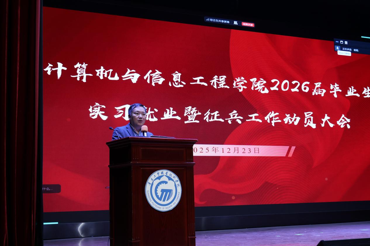 为全面推进2026届毕业生的就业实习与征兵工作,贯彻落实学校高质量就业的要求,引导学生树立正确的就业观和报国志向,计算机学院近日在学院礼堂、报告厅、教室,采用主副会场的形式,举办了2026届毕业生就业实习暨征兵动员大会。学院党总支书记张宁、党总支副书记张艳、副院长周宇、辅导员以及818名2026届毕业生参加了此次会议,会议由杨霞主持。