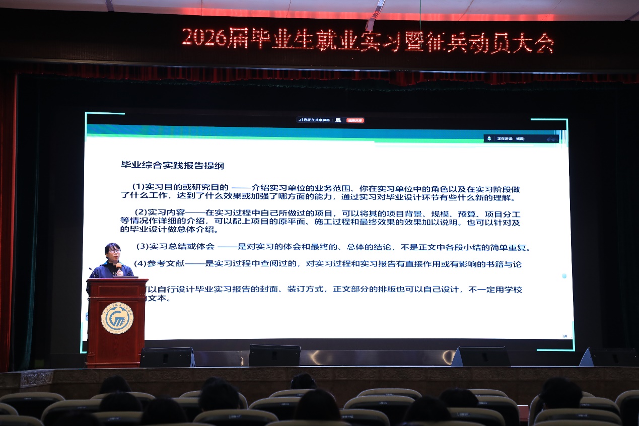 接着,周宇做毕业实习动员,介绍了毕业实习的教学定位、时间安排、平台使用等,强调岗位实习是培养学生实践能力、检验专业学习成果的重要环节;同时,围绕实习安全展开专题培训,从交通安全、人身安全、等多个维度进行细致讲解,要求学生严格遵守实习单位规章制度和学院实习纪律,及时上传实习日志与动态,确保实习过程安全有序、学有所获。