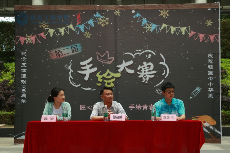 为了深入学习贯彻习近平新时代中国特色社会主义思想以及弘扬社会主义核心价值观和纪念“五四运动”100周年和“庆祝中华人民共和国成立七十周年”,培养学生传承工匠精神和提升学生的专业技能,激发学生学习兴趣,丰富学生第二课堂生活,机电工程学院于5月14日下午,在校训广场举办了“匠心筑梦 手绘青春 ”手绘比赛。本次大赛的评委由机电工程学院党总支副书记梁超鹏、工业设计教研室陈宓老师,袁新生老师担任。
