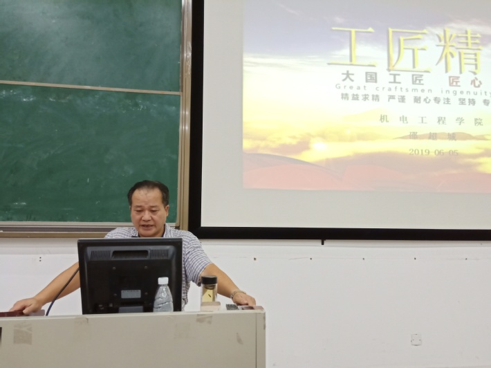 为了响应十九大报告中提出的“建设知识型、技能型、创新型劳动者大军,弘扬劳模精神和工匠精神”的号召,培育和弘扬严谨认真、精益求精、追求完美的工匠精神。6月5日晚上,机电工程学院党总支书记邵超城同志在明德楼2区205教室讲授了一堂思想政治理论课。本次学习由来自机电工程学院18级各班入党积极分子代表共150多名同学参加。