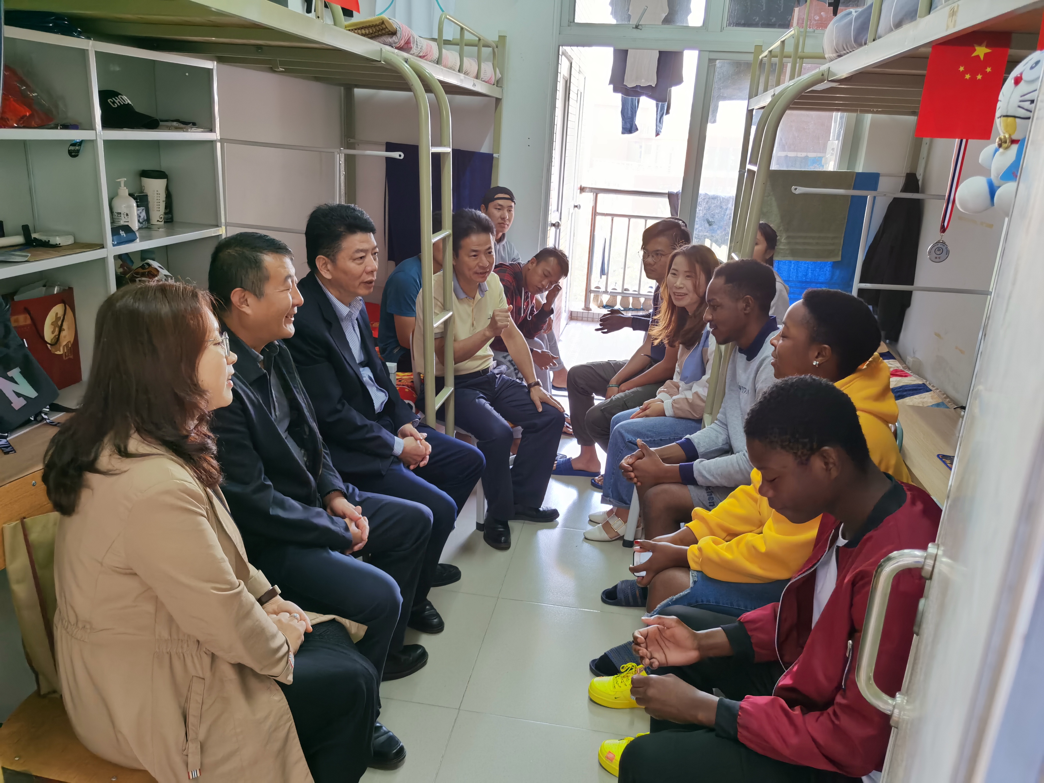 2019年11月23日,学校党委书记汤才,有色金属工业人才中心党委书记、总经理谢承杰等来到“一带一路”留学生宿舍,关心探望留学生并亲切交谈。学校党委委员、副校长陈珊兴,有色金属工业人才中心教育培训处副处长祝丽华,学校党委委员、党办主任黄雄志、学校办副主任苏文杰、机电工程学院辅导员邵盼盼等参加座谈会。