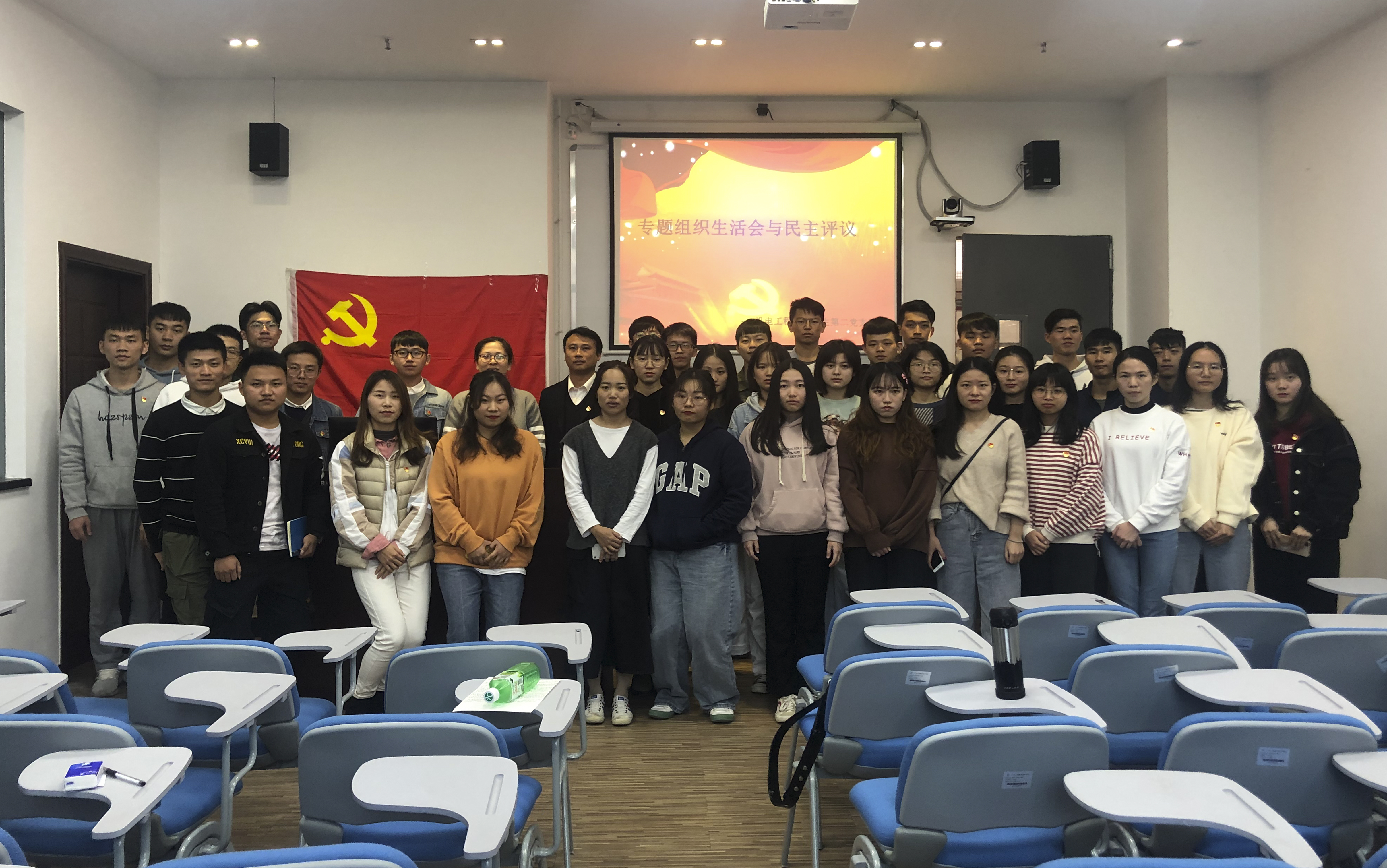 2019年12月10日星期二下午,机电工程学院学生第二党支部在明德楼1-215召开“不忘初心、牢记使命”专题组织生活会与民主评议会议。出席会议的有机电工程学院党总支副书记梁超鹏同志、学生第二党支部书记史旭同志、支委邵盼盼同志、王锐斌同志,以及机电工程学院学生第二党支部全体在校党员。