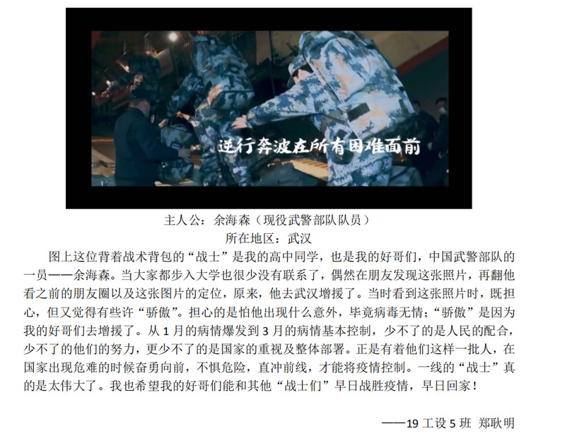 同学们从不同媒介了解各行各业人员为抗“疫”奉献自己的力量,并从文字中、镜头下表达对新时代“雷锋”同志们的赞赏。作为新时代大学生,在抗“疫”期间,坚持减少外出、不聚餐、勤洗手、外出戴口罩,不为国家添乱。同时,在家上网课,更要努力学习,珍惜时间,成为社会有用之才,为祖国的发展、社会的进步做出应有的贡献。