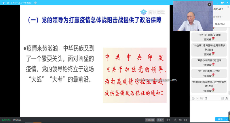 夏韩辉针对这次疫情,结合国家、地方、学校、师生等各个层面的具体做法,从“疫情的概况”、“狙击疫情时共产党的英明领导”、“疫情防控中感动中国的先进事例”以及抗“疫”成功给青年学生的启示等四个方面,深入浅出地讲述了战“疫”成果与中国特色社会主义制度优势之间关系。号召广大入党积极分子坚定信心、齐心协力、团结应对,凝聚起战胜疫情强大合力,在疫情的洗礼下,要更加坚定道路自信、理论自信、制度自信、文化自信。