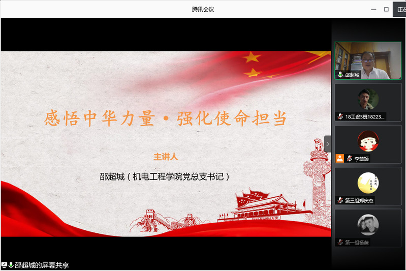 7月6日晚上20点,机电工程学院党总支书记邵超城同志线上为机电工程学院党总支2020年上半年发展对象讲授了一堂以“感悟中华力量,强化使命担当”为专题的思政“第一课”。