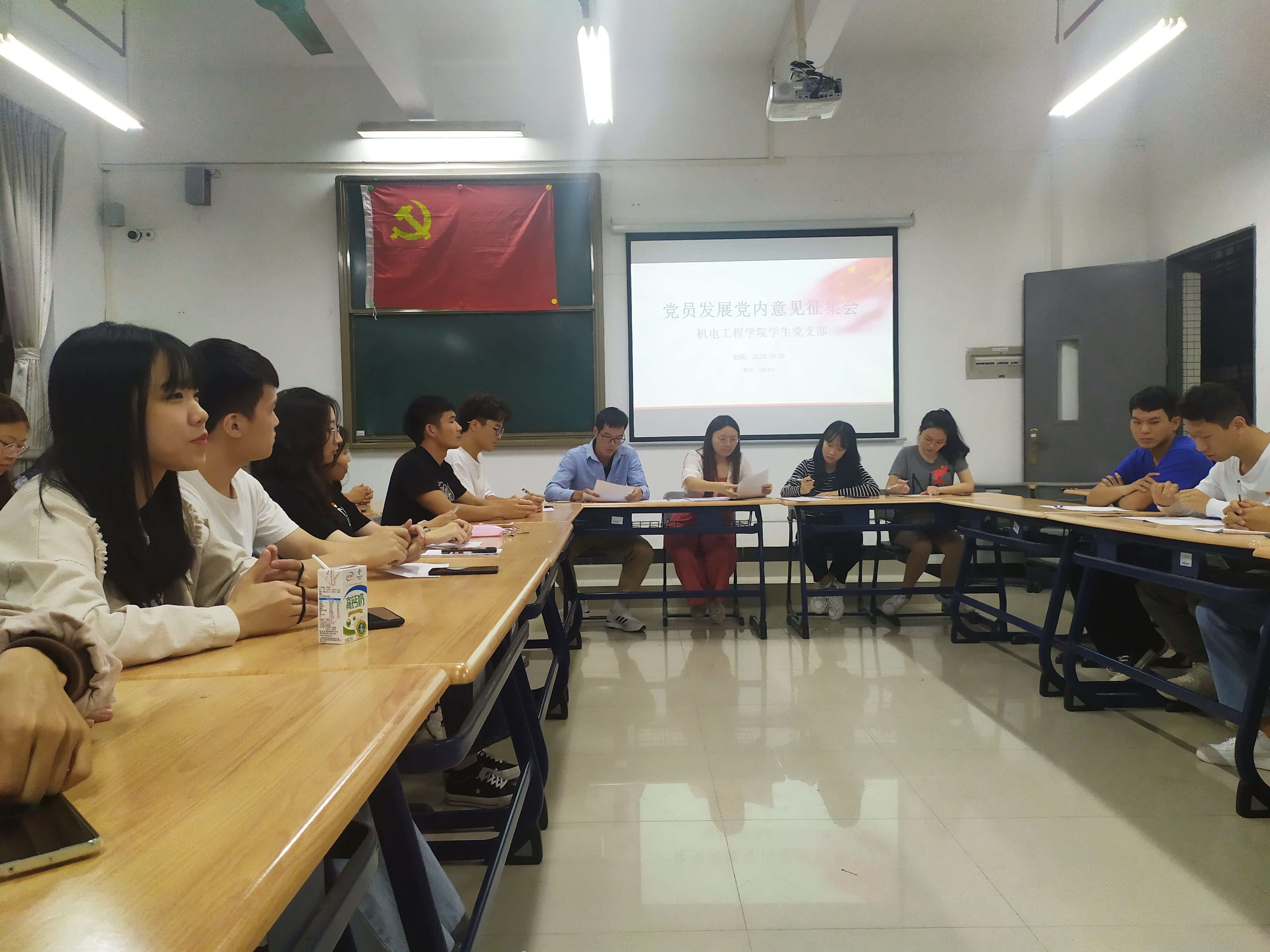 2020年10月26日19时,机电工程学院学生党支部在明德楼1-313召开了党员发展党内意见征集会议,出席会议的成员有学生第一党支部书记李慧颖同志、纪检委员覃才尧同志和支部全体在校党员,会议由李慧颖同志主持。