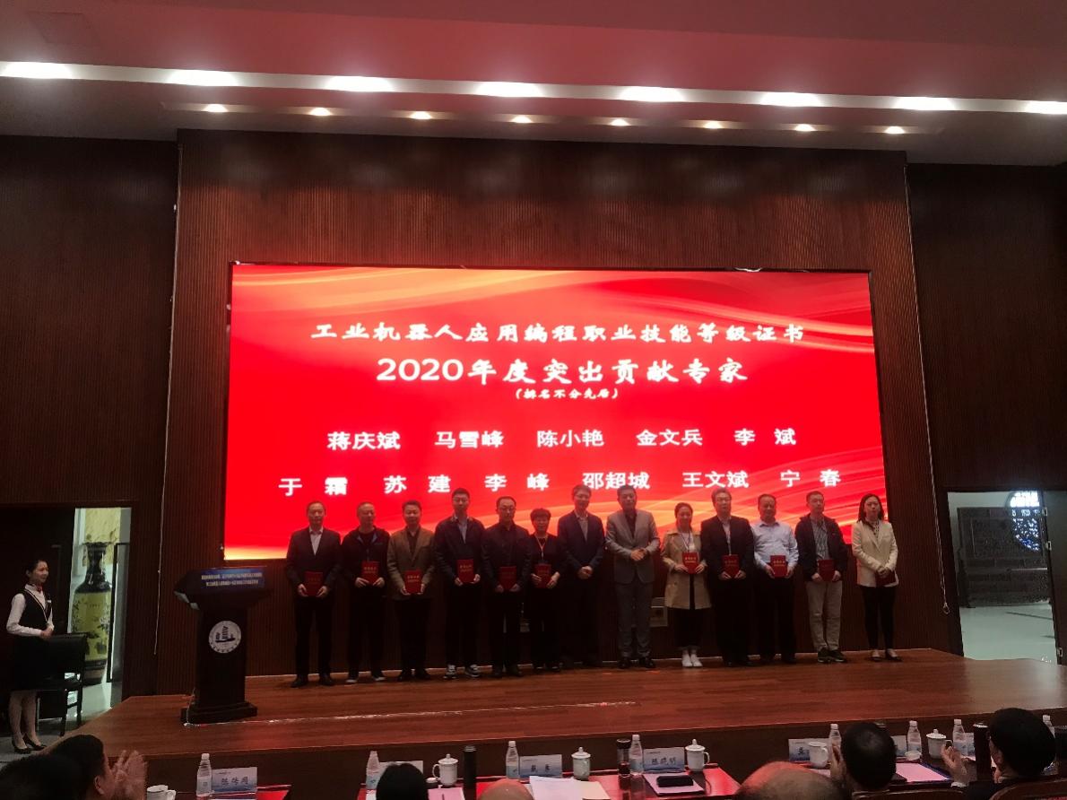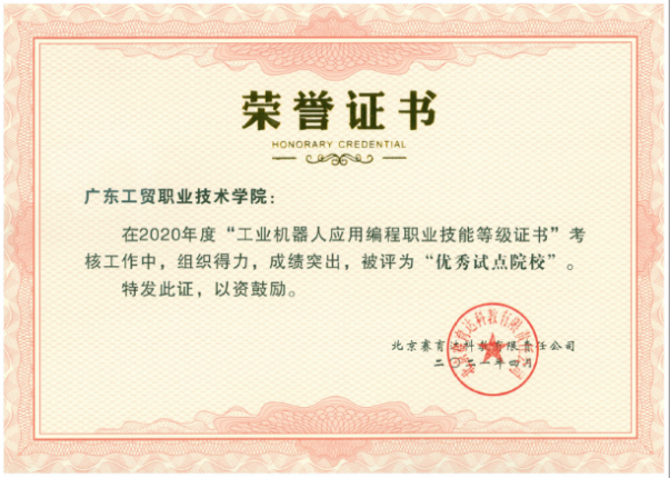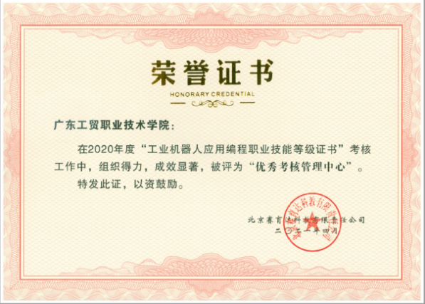 在推进1+X证书制度试点任务过程中,我校去年以广东省管理中心为任,积极完成本校的培训考核任务,并积极联系其他兄弟院校组织培训和考核,去年年底共考核考生900人次。赛育达公司在推荐遴选、综合考察的基础上,我校被评为2020年度工业机器人应用编程1+X证书制度试点工作优秀考核管理中心和优秀试点院校,机电工程学院邵超城被评为突出贡献专家、周佳杰被评为先进工作者、孙涛、王锐斌等被评为优秀考核师。