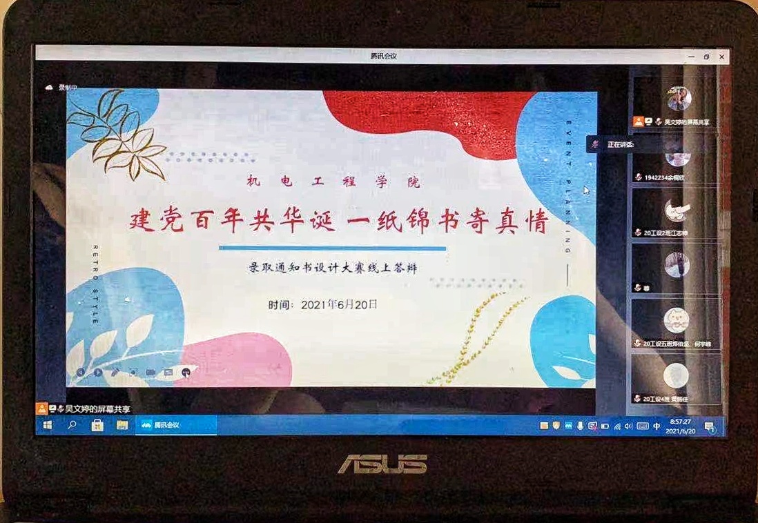新生录取通知书是每位工贸新人的第一封“情书”,蕴含着学校的办学理念、文化精神,对每一位工贸人都有着特殊的意义。巧逢建党100周年,一纸锦书,寄托浓浓的爱党、爱国、爱校情怀。机电工程学院党总支于5月推出“建党百年共华诞 一纸锦书寄真情”录取通知书设计大赛,收到投稿作品30余幅。6月20日上午9点,该活动通过腾讯会议顺利举行,担任本次活动的评委老师有机电工程学院陈丹蓉、陈宓、吴文婷。