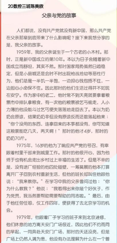 经过公平、公正的评审,此次活动共评选出一等奖1名:20数控3班的陈美欣《父亲与党的故事》;二等奖2名:20工设3班的蔡东晓《百年党史,敲出星星之火》,19机器人1班的吴宇绵《危急中国,小红船的共鸣》;三等奖3名:20自动化1班的杨端贤《记忆珍贵的党史》,19自动化3班的李耿东《忆岁月,颂英雄,洒红色》,20工设3班的张双蓉 《忆党峥嵘,担青年使命》,以及参与奖若干。