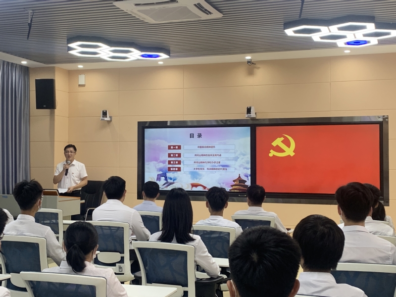 刘贻新结合习近平总书记在“庆祝中国共产党成立100周年大会”上的讲话精神,从“中国革命精神谱系”、“井冈山精神的由来及其内涵”、“井冈山精神与学校办学沿革”、“大学生党员,传承精神的时代担当”四个方面,详细地讲述了“井冈山精神”。井冈山精神的精髓在于胸怀理想、坚定信念;核心内容在于实事求是、勇闯新路;重要内容在于艰苦奋斗、敢于胜利;人生观价值观和道德情操上体现在依靠群众、无私奉献。伟大的井冈山精神集中反映了中国共产党的优良精神和传统作风。刘贻新运用井冈山精神和学校发展史对新时代大学生党员提出了殷切期望,争做习近平总书记所期望的“以实现中华民族伟大复兴为己任,增强做中国人的志气、骨气、底气,不负时代,不负韶华,不负党和人民的殷切期望”的新时代的中国青年。