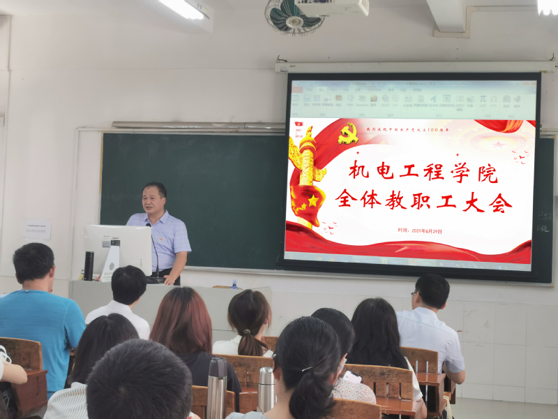 2021年6月29日,机电工程学院于天河校区教学楼202课室召开了全体教职工会议。机电工程学院领导班子及全体教师参加会议,会议由机电工程学院党总支书记邵超城主持。