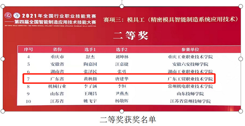比赛中,团队成员在老师们的带领下,两名选手在比赛中以饱满的热情,扎实的专业功底,过硬娴熟的专业操作技能水平,沉着应赛,克服疫情下的重重困难,圆满地完成了比赛的所有项目,展示了新时代工贸人顽强拼搏的精神和技能健儿傲人的风采,经过8个小时的角逐,比赛考核内容包括三大模块:(理论考核+4套模具设计+智能成型)最终获得模具工(精密模具智能制造系统应用技术)赛项国家二等奖的好成绩,为学校争取了荣誉,为广东省增添了光彩。
