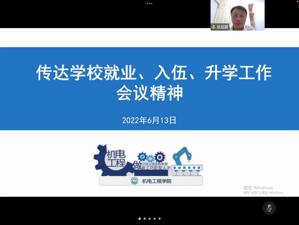 机电工程学院党总支副书记梁超鹏传达学习全国、全省及省教育厅高校毕业生就业、征兵工作会议精神,并结合学院2002届毕业生就业、征兵、升学工作情况分析存在问题,部署下一步就业工作内容。梁超鹏表示要认真贯彻执行我校2002届毕业生“百年冲刺”就业工作方案,发挥班主任工作室、辅导员工作室职业能力提升与生涯发展功能,建立就业困难毕业生台账,精准落实帮扶机制,全力做好2022届毕业生毕业去向落实工作。