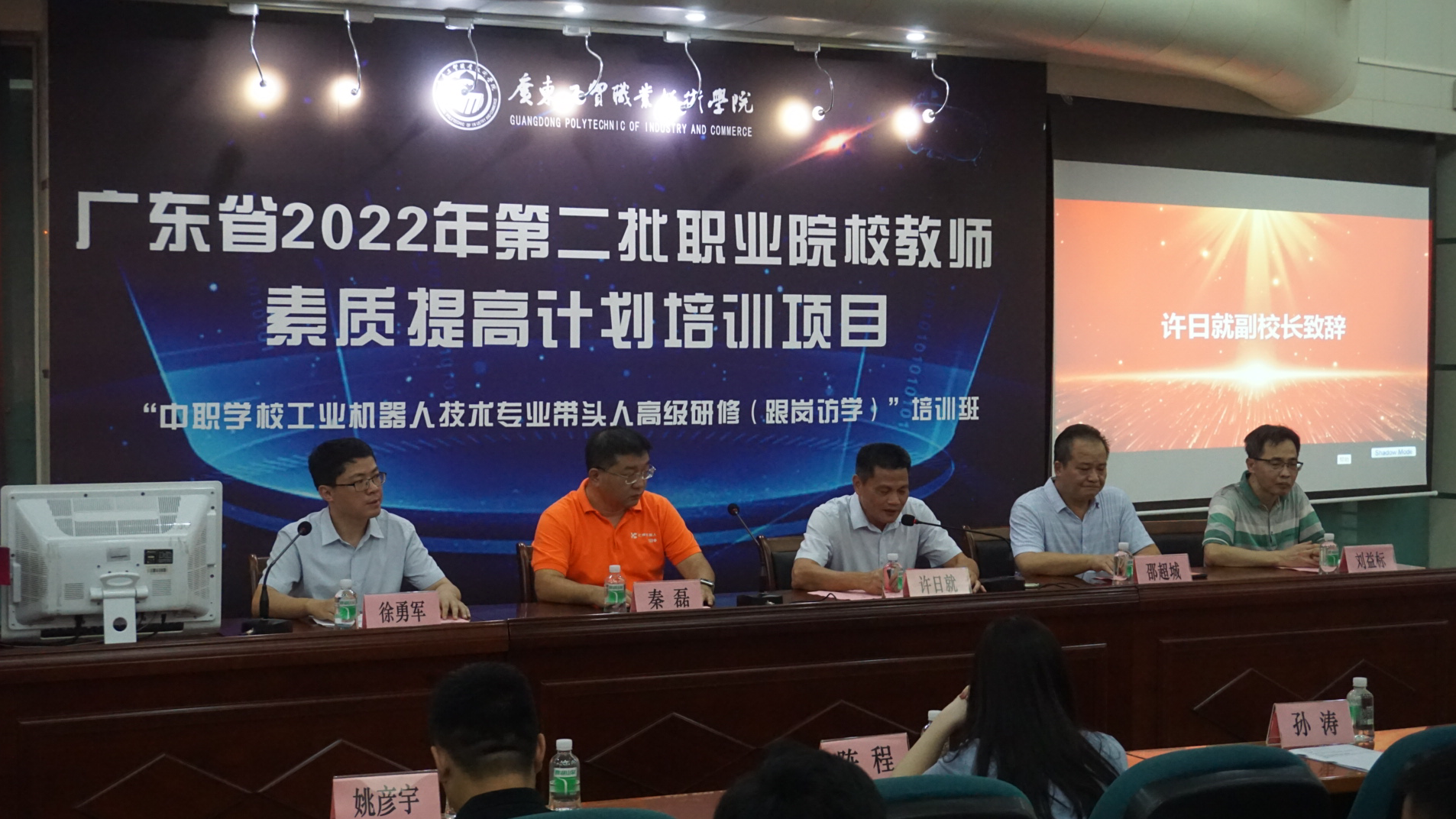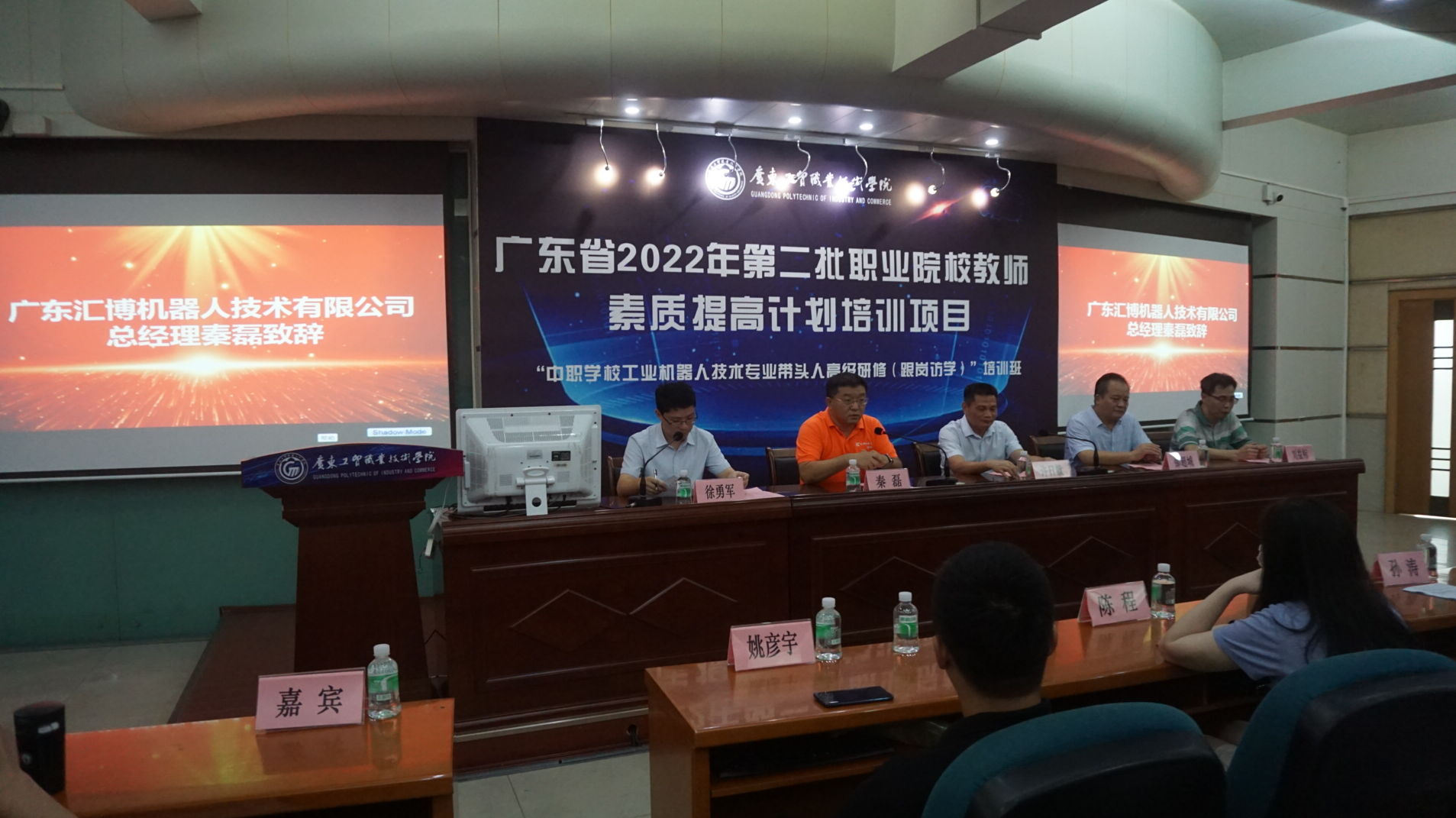 走进“国培”,做学习型教师,7月29日下午2点30分,我校在天河校区五楼报告厅举办了“中职学校工业机器人技术专业带头人高级研修班(跟岗访学)培训”(国培)开班仪式典礼。出席典礼的校内领导包括学校党委委员、副校长许日就,机电工程学院党总支书记邵超城,机电工程学院院长徐勇军,机电工程学院机器人及智能控制系系主任刘益标,机电工程学院机器人及智能控制系系副主任孙涛,继续教育与培训学院培训科科长陈程,国培项目的合作企业广东汇博机器人技术有限公司总经理秦磊,江苏汇博机器人技术股份有限公司华南大区销售总监姚彦宇,来自省内各中职院校的30名学员以及国培项目工作组全体成员参加了开班仪式。会议由徐勇军主持。