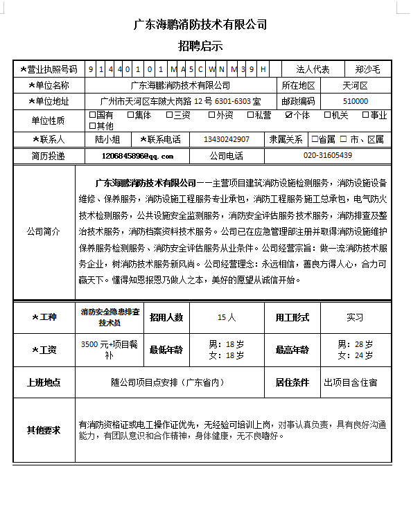 广东海鹏消防技术有限公司招聘信息
