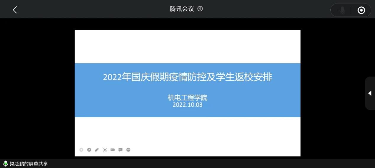 为落实疫情防护工作,有效控制和降低国庆假期的疫情传播风险,坚决筑牢校园疫情防控安全防线,保障师生假期结束能够安全返校,机电工程学院于10月3日晚上8点召开“国庆假期疫情防控及学生返校安排”线上会议。本次会议由机电工程学院党总支副书记梁超鹏主持,学工办主任严惠琴和全体辅导员、班长参加会议。
