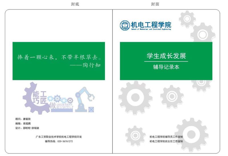 辅导记录本封面以齿轮元素代表专业特色,以陶行知先生的名言“捧着一颗心来,不带半根草去”为教育理念。内页主要分为三个部分,分别为学习研讨、学生辅导记录情况、案例分析。