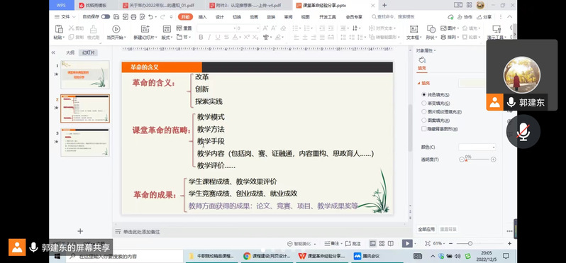 团队成员郭建东副教授从课堂革命的含义、范畴及成果三大部分分享“课堂革命”典型案例申报经验,总结“课程意义-存在问题-计划方案-革命成效”四步法的摘要思路,并结合申报书从问题解决策略和实施效果等方面逐一分析,深入浅出。