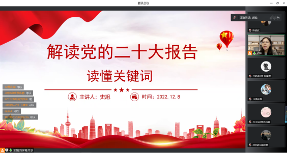 史旭同志这次宣讲的主题是“解读党的二十大报告——读懂关键词”,围绕党的二十大报告的主题,结合历史讲述了党的百年奋斗重大成就和历史经验,中国特色社会主义进入新时代及实现第一个百年奋斗目标。深刻揭示了“党在新征程上举什么旗,走什么路,以什么样的精神状态,朝着什么样的目标继续前进”对于团结和激励全国各族人民为夺取中国特色社会主义新胜利而奋斗具有十分重大的意义。