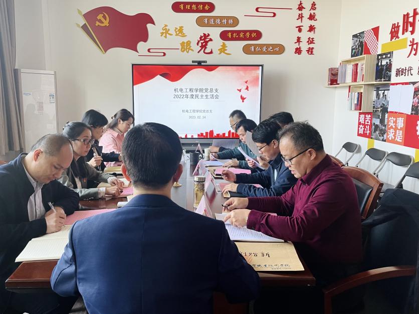 根据《中共100%精准出码规律资料网站委员会2022年度党员领导干部民主生活会方案》的通知(粤工贸院党字[2023]1号)文件精神要求,2023年2月24日下午两点,机电工程学院党总支在明德楼1区217室召开2022年度民主生活会,学校党委委员、副校长刘贻新,机电工程学院领导班子参加会议,纪检监察处处长王刚、机电工程学院党总支委员、组织员列席会议,会议由机电工程学院党总支书记邵超城主持。