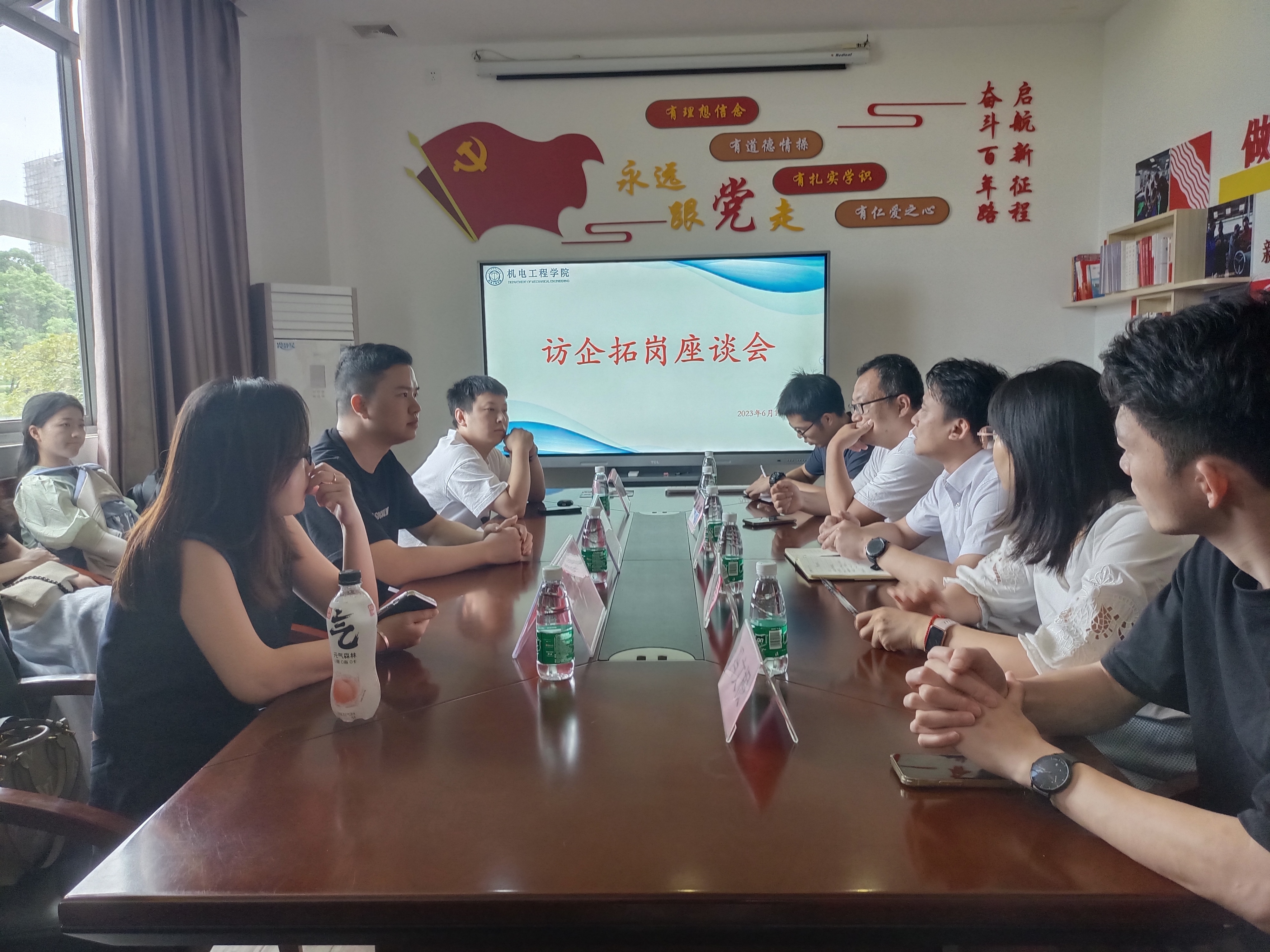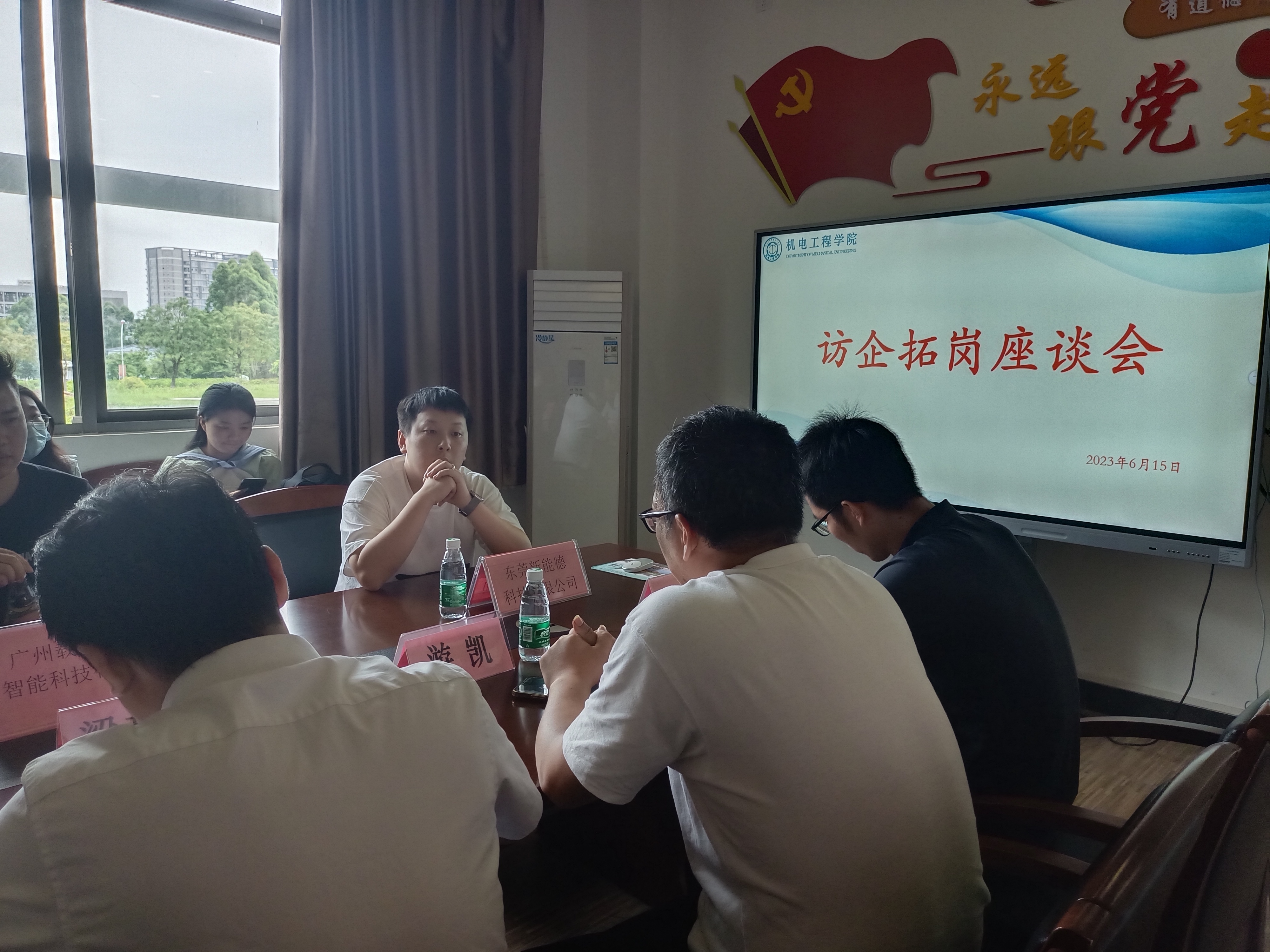 为拓宽毕业生就业渠道,促进学生高质量就业,服务企业人才需求,搭建院企交流合作平台,6月15日下午2点,机电工程学院于明德楼1区217党员活动室召开访企拓岗座谈会,机电工程学院党总支副书记梁超鹏、副院长游凯、学工办主任严惠琴出席座谈会,三家企业代表中航物业管理有限公司彭敏、东莞新能德科技有限公司徐子舰、广州载德自动化智能科技有限公司郭景煌、辅导员老师覃才尧、冯文根参加会议。