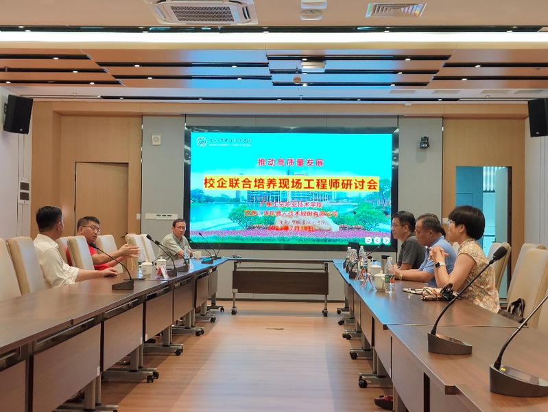 广东汇博机器人技术有限公司董事长秦磊、江苏汇博机器人技术股份有限公司副总裁崔晓辉应邀参加了专题研讨会,会议由学校党委委员、副校长刘贻新主持,机电工程学院党总支书记邵超城、机电工程学院院长徐勇军、机器人及智能控制系副主任孙涛、专业带头人孔令叶、机器人及智能控制系骨干教师贺静参加会议。