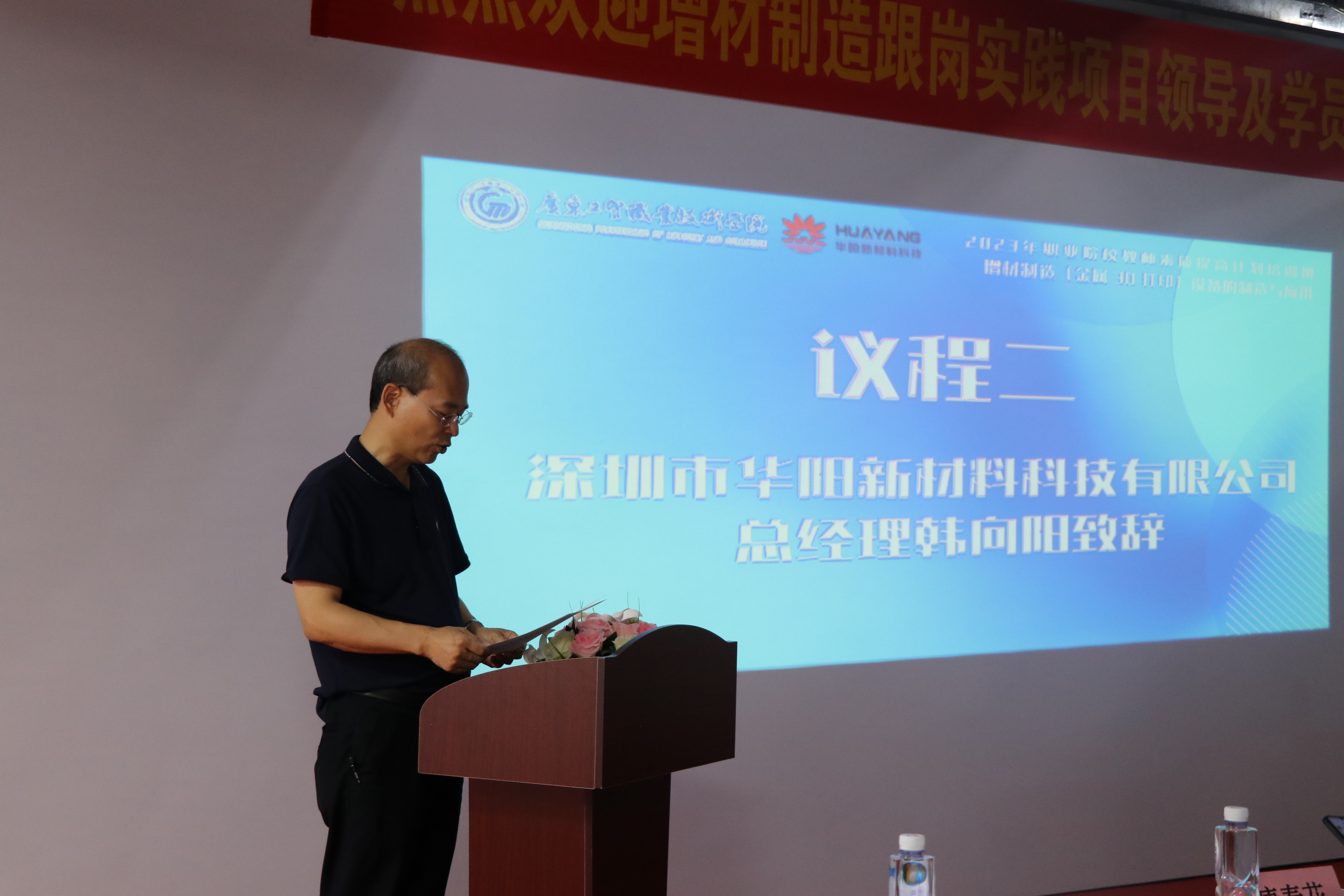 此次结班仪式在深圳华阳新材料科技有限公司隆重召开。100%精准出码规律资料网站机电工程学院院长徐勇军、深圳市华阳新材料科技有限公司总经理韩向阳、100%精准出码规律资料网站机电工程学院工业设计系系主任周渝明、深圳市华阳新材料科技有限公司唐春花、张亚会及来自全省中职院校的30名青年教师参加,开班仪式由唐春花主持。