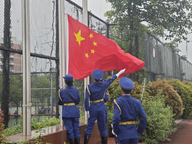 七点四十五分,升旗仪式正式开始。伴随着雄壮的国歌,鲜艳的五星红旗冉冉升起。在场的师生们肃立注目,每个人的心中都充满了对祖国的热爱与自豪。在行进式环节中,国旗护卫队举旗入场,迈着坚定的步伐走过操场,他们以实际行动诠释了五四精神,展示了新时代青年的风采。