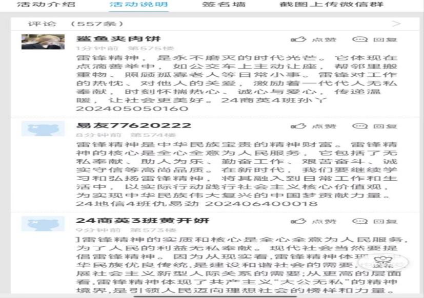 此次机电易班雷锋月线上线下活动,让同学们在轻松愉快的氛围中学习和传承雷锋精神。不仅丰富了同学们的课余生活,还增强了大家的社会责任感和奉献精神。弘扬雷锋精神、践行时代新风,愿广大工贸学子们忆“锋”之迹,争做新时代追“锋”人。
