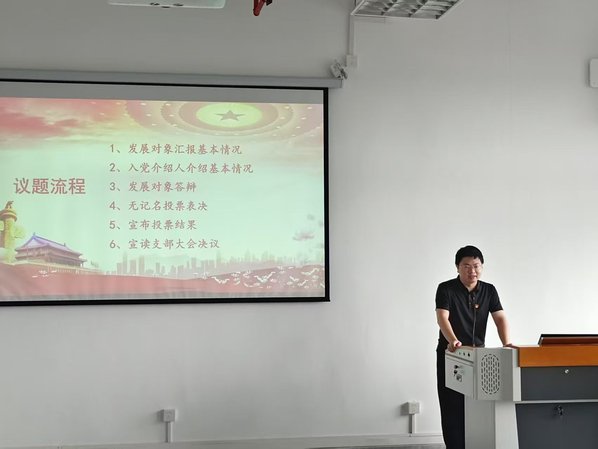 会议正式开始后,马听首先向与会人员详细介绍本次代表大会的议程,并现场清点到会党员人数,着重强调会议纪律要求,确保流程严谨规范。随后,全体参会人员庄严肃立,齐声奏唱《国际歌》,在激昂旋律中拉开大会帷幕。随后,6位发展对象依次上台进行答辩。他们以饱满的热情,全面汇报个人情况:从对党的性质宗旨的深刻理解,到入党初心的真诚袒露;从个人学习工作履历,到家庭及主要社会关系状况;再到需要向党组织说明的相关事项,均进行了细致阐述。同时,他们坚定表达了对马克思主义的信仰、对党的忠诚,展现出积极向党组织靠拢的决心,并郑重提交接收为中共预备党员的申请。