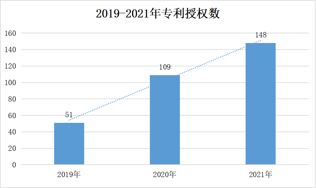 二是我校专利授权数量大副提升。2020年1月——2022年5月,学校获各类专利及软件著作权授权304件。根据年份统计口径,2019年、2020年、2021年分别获各类专利及软件著作权授权51件、109件、148件,因此学校近3年的专利数量授权的递增率均在35%以上,如图1所示。