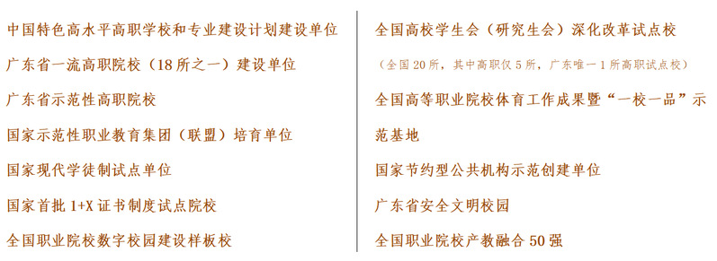 组织机构完善体系健全,专业建设成效显著。近年来,学校大力发展智能制造、新能源、新材料以及现代交通运输、高效物流、电子商务等产业急需紧缺专业,对接广东省规划发展的七大支柱产业、九大战略新兴产业、六大未来产业和十大重大科技产业集群,依托优势专业构建了测绘地理信息技术、模具智能制造、虚拟现实应用技术等10个专业群。以校企合作产业园为纽带,与龙头企业共建了测绘地理信息、智能制造、信息安全、VR/AR、新能源汽车等5个新工科特色产业学院和1个创新创业学院,培养行业化、个性化卓越技术技能人才。目前,现有专业44个,其中国家级骨干专业4个,中央财政支持的重点专业2个,省级一类品牌建设专业3个,省级二类品牌建设专业3个,省级高职教育示范性专业4个,省级高职教育重点专业9个,省级现代学徒制人才培养试点专业8个,省一流高职院校高水平专业建设项目9个,高职本科协同育人专业4个。学校在2019年成为国家首批“1+X证书制度试点”院校,目前已获得“1+X”证书制度试点专业30个55种,新建2个“1+X”证书实训考证基地。