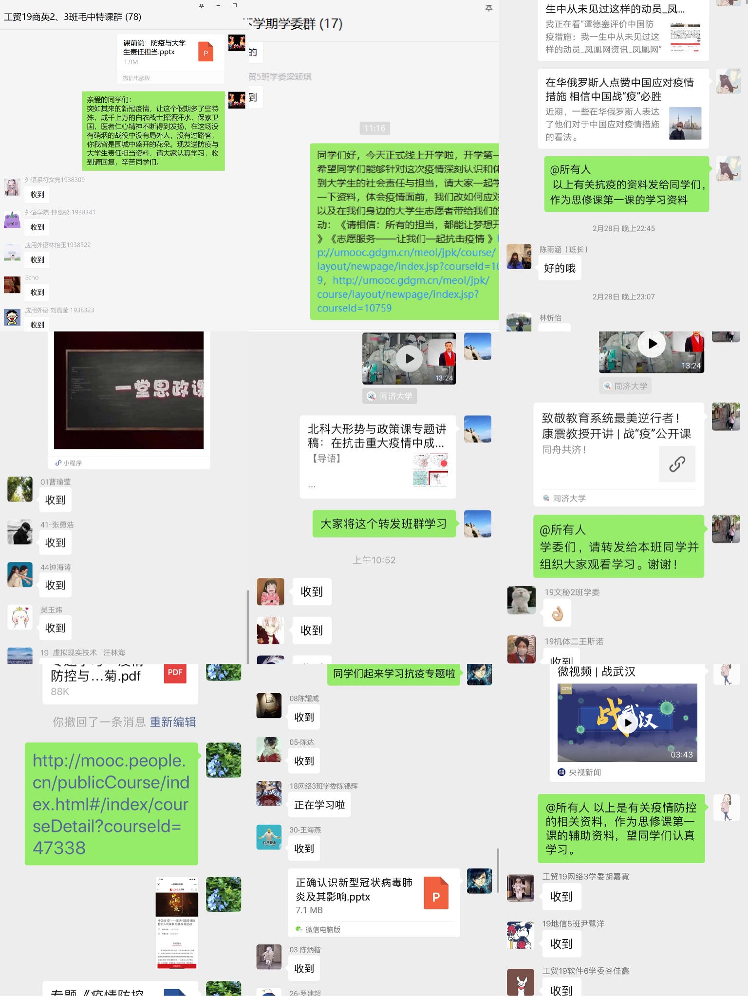 (教师通过微信群向学生发布防疫与大学生责任担当专题材料)