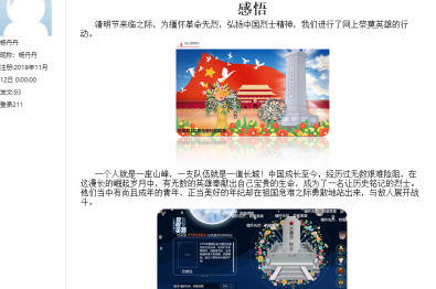 通知下发后,同学们迅速行动起来,纷纷按照通知要求开展了网上祭扫活动并第一时间在各任课教师优慕课平台进行互动交流。交流中,有的同学学习到了革命先烈的崇高理想信念和革命斗争的光辉事迹;有的同学被革命烈士抛头颅洒热血,不惜牺牲个人生命的事迹所感动;有的同学向革命英豪起誓,愿做孜孜不倦、不负韶华、勤奋学习、严于律己,不忘使命的当代大学生,努力为祖国建设贡献青春力量;还有的同学表示要向革命英雄学习,为实现“两个一百年”的奋斗目标砥砺前行,立志成为中国特色社会主义事业合格的建设者和可靠的接班人;也有的同学专门走进了“新冠病毒牺牲烈士纪念馆”,致敬在本次疫情中牺牲的“最美逆行人”。