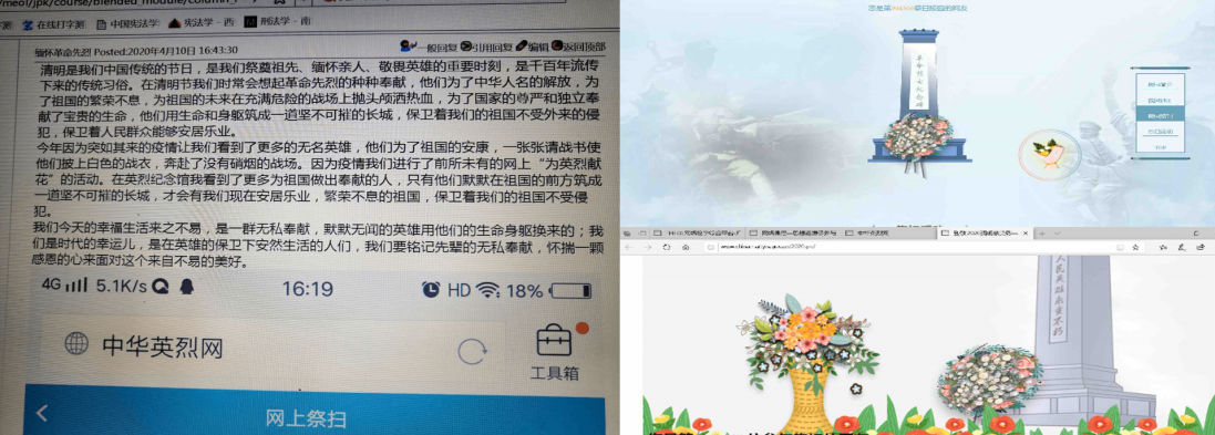 清明节是我国人民悼念逝者、寄托哀思、缅怀先人的传统节日。无数志士仁人,为了民族的解放、国家的独立和人民幸福抛头颅、洒热血,谱写了惊天地、泣鬼神的悲壮而又激越的历史篇章。鉴于当前疫情依然严重、学生并未返校等实际情况,为纪念这个有着深远意义的日子,缅怀革命先烈,向抗疫英雄致敬,院“基础”课党小组(教研室)根据《广东省新冠肺炎防控指挥办疫情防控组关于印发广东省清明祭扫期间新冠肺炎疫情防控工作指引的通知》精神,按照《马克思主义学院直属党支部疫情防控期间组织生活安排》,于第五周(330--46组织全体“基础”课教师及2019级全体学生开展“缅怀革命先烈、向抗疫英雄致敬”为主题的清明(网上)扫墓实践活动,并就扫墓感悟在学校优慕课网上进行交流。
