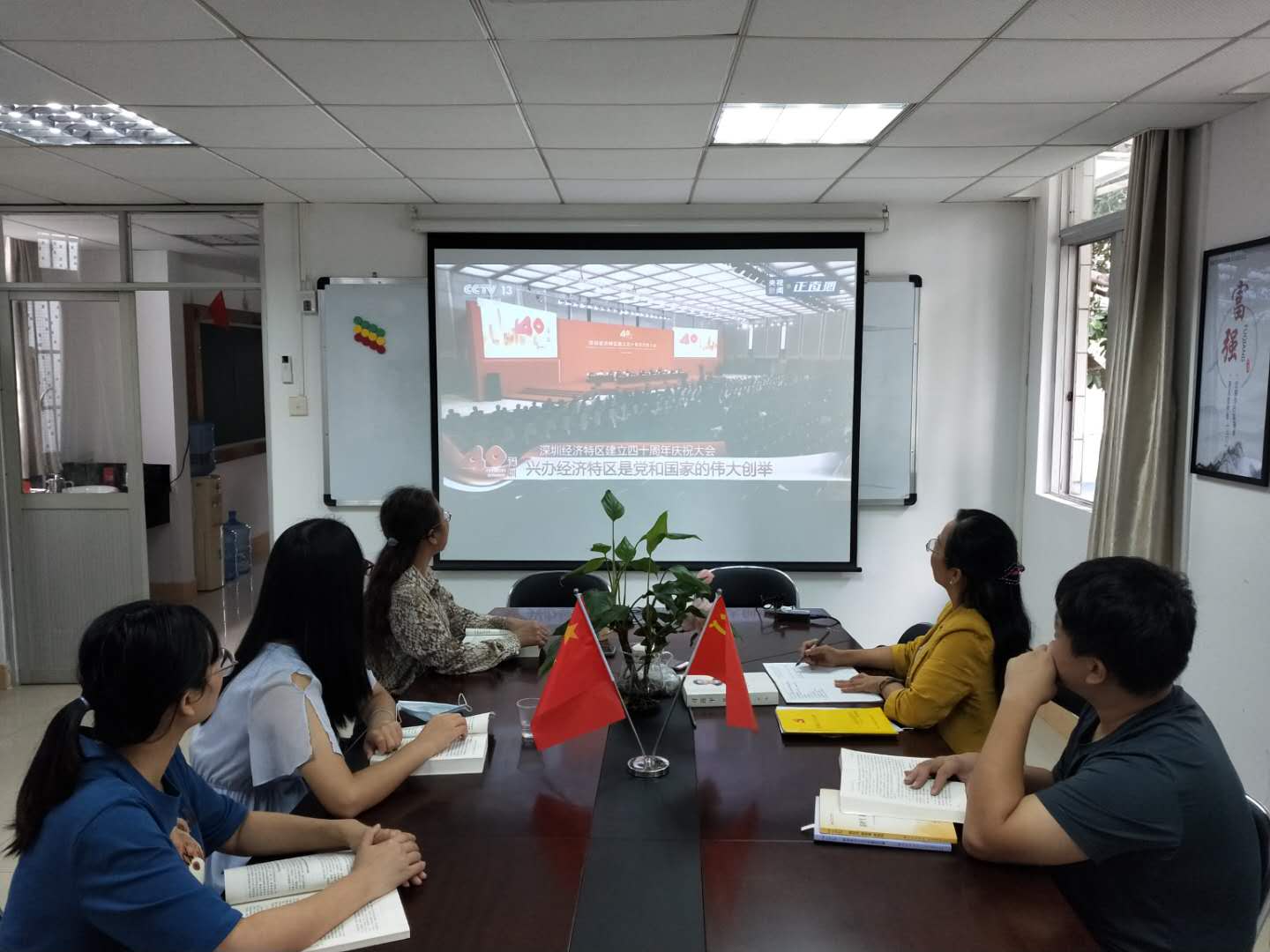在庆祝大会上,习近平总书记充分肯定了经济特区为全国改革开放和社会主义现代化建设作出的重大贡献;总结了经济特区40年改革开放、创新发展积累的宝贵经验;对新时代深圳经济特区建设提出明确要求,对经济特区党的建设和精神文明建设作出重大部署。此次大会向我们展示了一个鲜活的、生机勃勃的深圳经济特区。40年来,一代又一代人在这片热土上挥洒汗水,一个又一个画面诉说着深圳特区的沧桑巨变,在观看直播的过程中,教师们深深地被深圳的发展速度及其所散发出来的磅礴力量所震撼。正如习近平总书记所说,深圳广大干部群众披荆斩棘、埋头苦干,用40年时间走过了国外一些国际化大都市上百年走完的历程,这是中国人民创造的世界发展史上的一个奇迹。