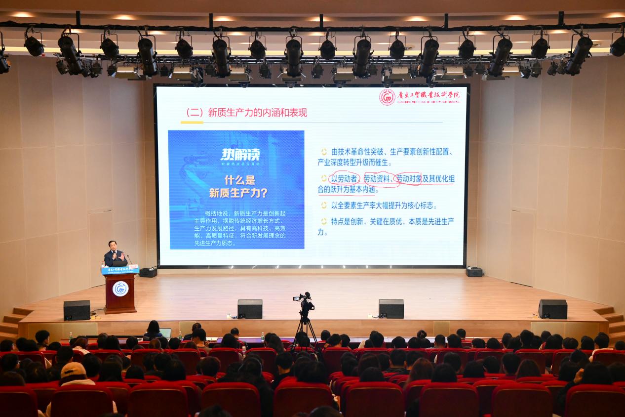 授课的第三部分讲述了职业院校和学子们如何把握机遇,在实现现代化新广东实践中履行使命担当,展现工贸作为。何汉武指出,未来我校将围绕数字产业化和产业数字化变革,在人才培养目标、教学内容、教学手段等方面实施数字化转型和数字赋能,培养适应产业发展所需的人才,为广东高质量发展提供人才和技术支撑。同时,何汉武鼓励工贸学子要兼具家国情怀和世界眼光,把握职业教育前景广阔的发展机遇,勇于创新,乐于创新,善于创新,积极投身于中国式现代化的广东实践,努力成为新质生产力发展的高素质技术技能人才。