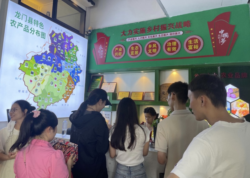 接着,党员们来到了位于龙门县农贸市场的“名特优新”农产品展销中心。展销中心囊括了龙门本地众多特色农产品,通过线上线下多渠道同步发力,大大带动了龙门本地农产品销售。这里不仅展示了龙门县现代农业发展成果,同时也承担着消费帮扶边远贫困群众销售自家种养农产品的任务,也称“龙门县消费扶贫农产品展销馆”,只见香甜可口的龙门大米、酥脆生香的龙门米饼以及粉葛制品、南昆山毛茶等产自龙门沃野良田的农特产品摆满了货架。通过平台的作用,使龙门消费扶贫农产品完成了从田头到餐桌、从产品到商品、从收成到收入的“龙门一跃”,帮助群众实现致富梦。参观过程中,马院党员教师纷纷自掏腰包购买这些优质的龙门农特产,助力龙门乡村振兴。