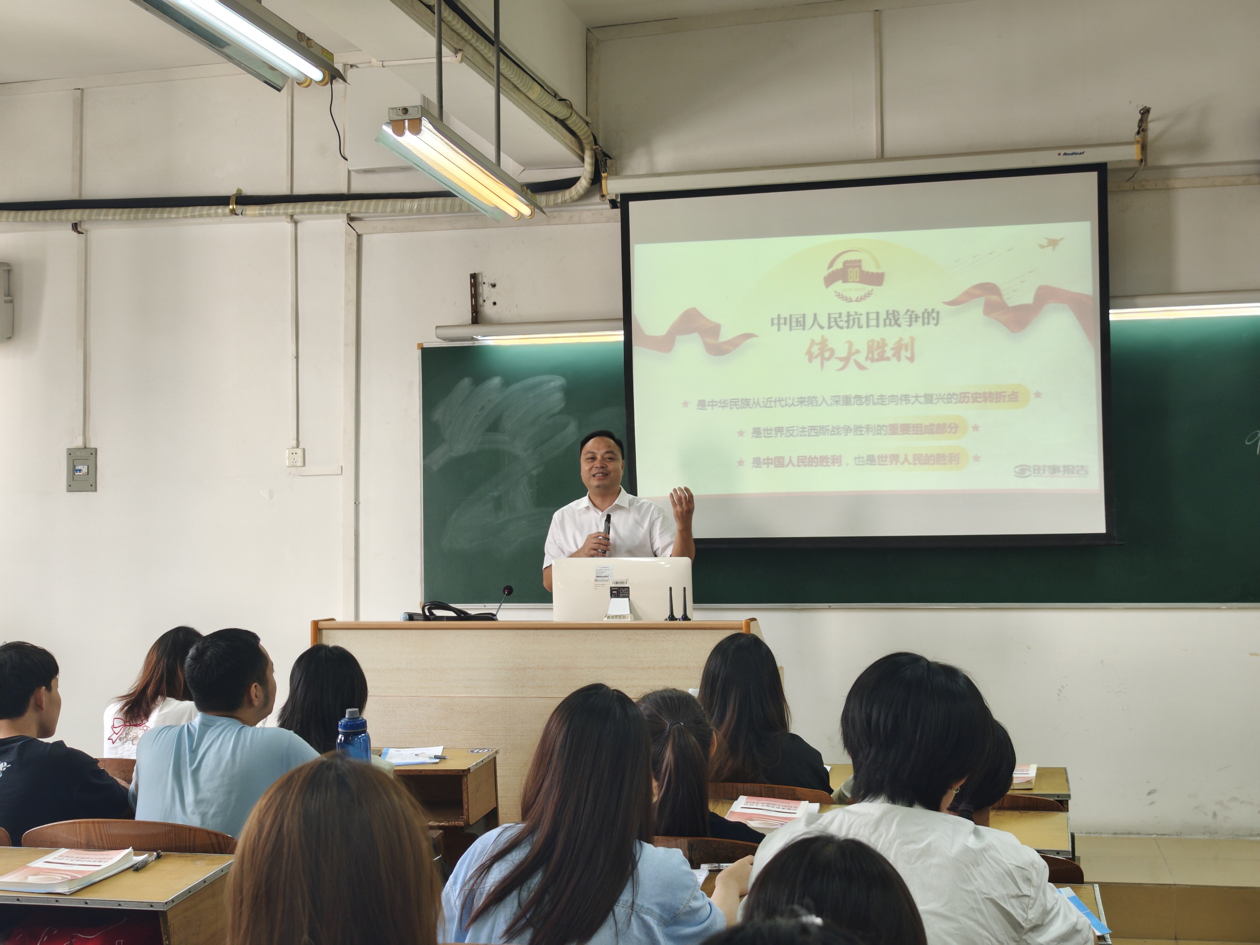 揭英荣从“铭记历史 正义必胜”“民族壮举 浓墨重彩”“精神丰碑 永不磨灭”“珍爱和平 开创未来”四个维度,深入阐释中国人民抗日战争的伟大历程、历史意义与时代价值。他以“九一八”事变94周年和中国人民抗日战争暨世界反法西斯战争胜利80周年系列纪念活动为切入点,系统回顾了抗日战争长达14年的艰苦卓绝历程,强调中国共产党在全民族抗战中的中流砥柱作用,指出中国人民抗日战争不仅是中华民族从近代以来陷入深重危机走向伟大复兴的历史转折点,也是世界反法西斯战争胜利的重要组成部分。揭英荣通过详实的历史资料和生动的案例,向学生展现了中国人民在极端困难条件下所表现出的爱国主义情怀、民族气节、英雄气概和必胜信念。